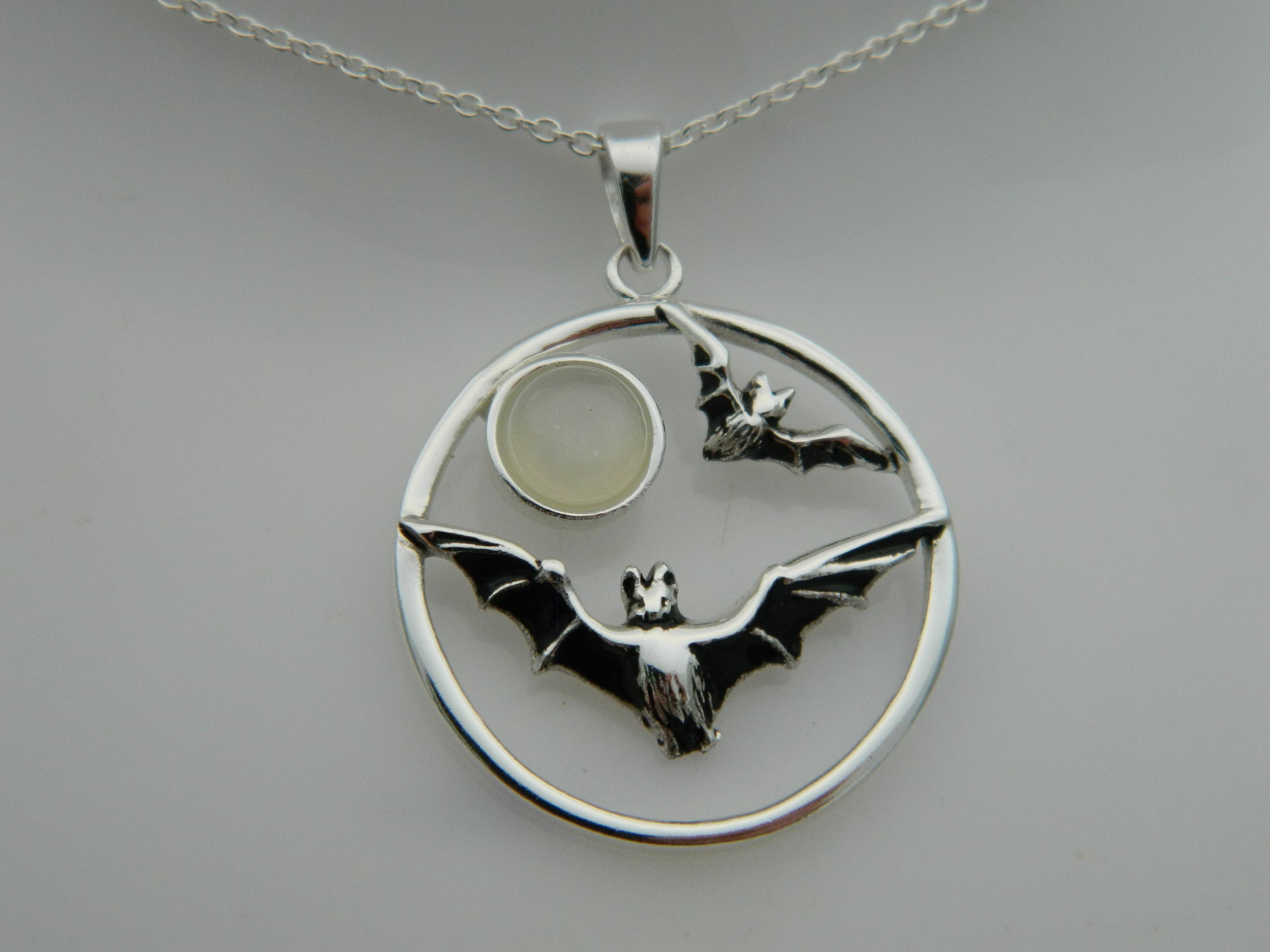 The pendant features two bats flying with a full moon. The full moon is set with a rainbow moonstone cabochon. This is all set in a round surround which is 3d and has amazing detail. Finished with a high polish so it looks stunning. Comes with a 46cm sterling silver anti tarnish Italian cable chain and presentation box.