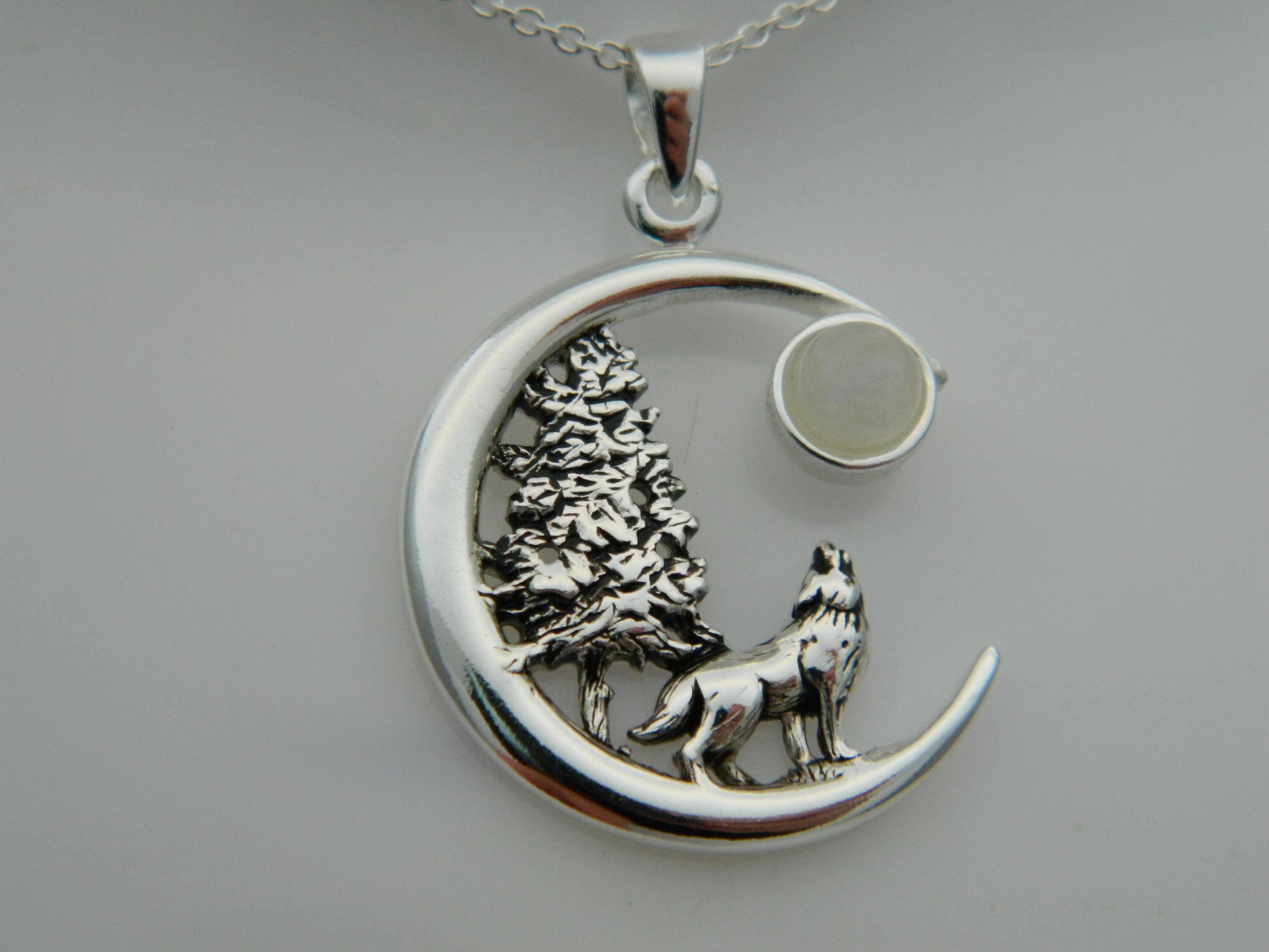 925 Sterling Silver Forest Wolf Full Moon Moonstone Pendant & Chain.