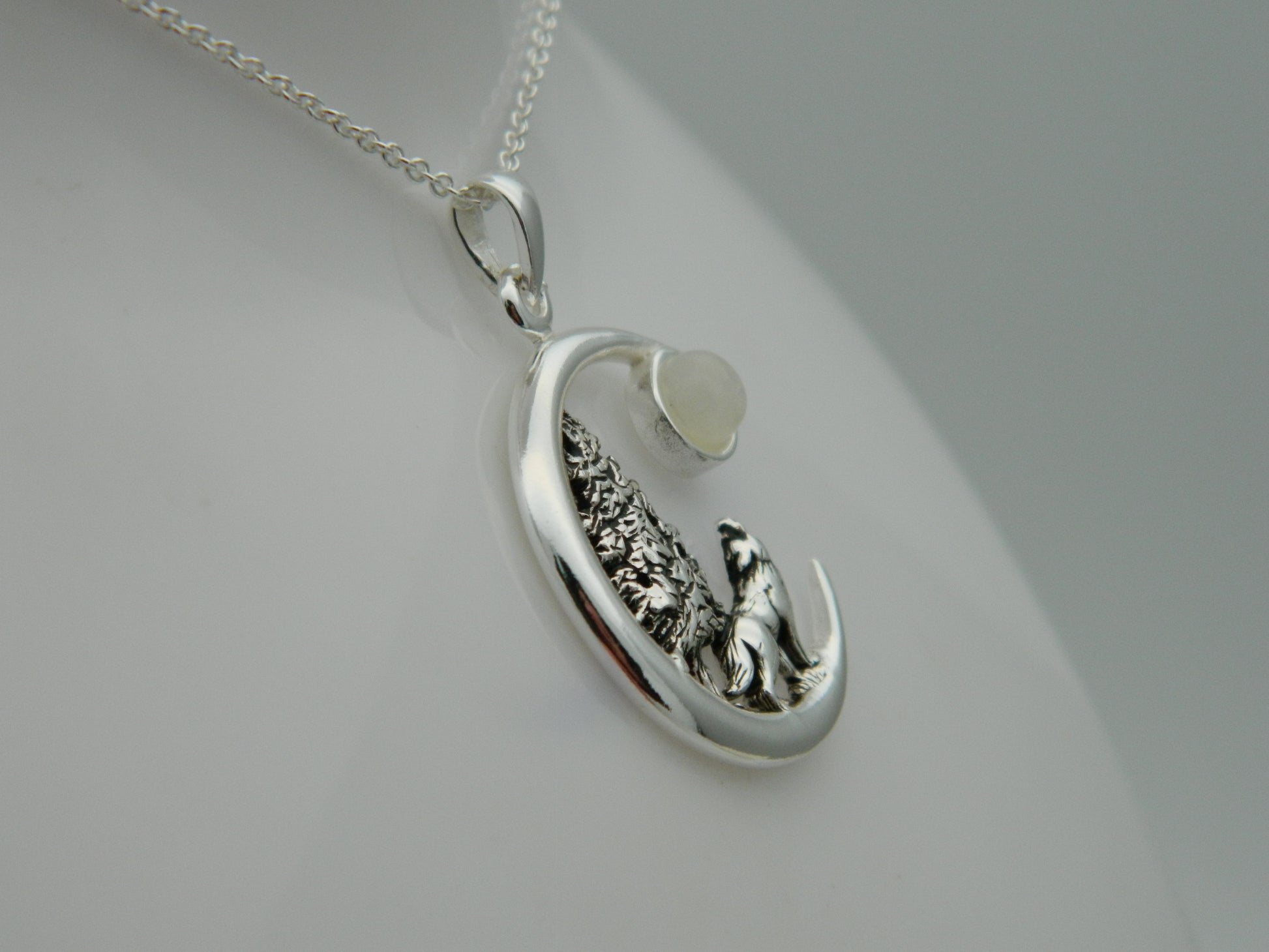Sterling Silver Forest Wolf Full Moon Moonstone Pendant & Chain