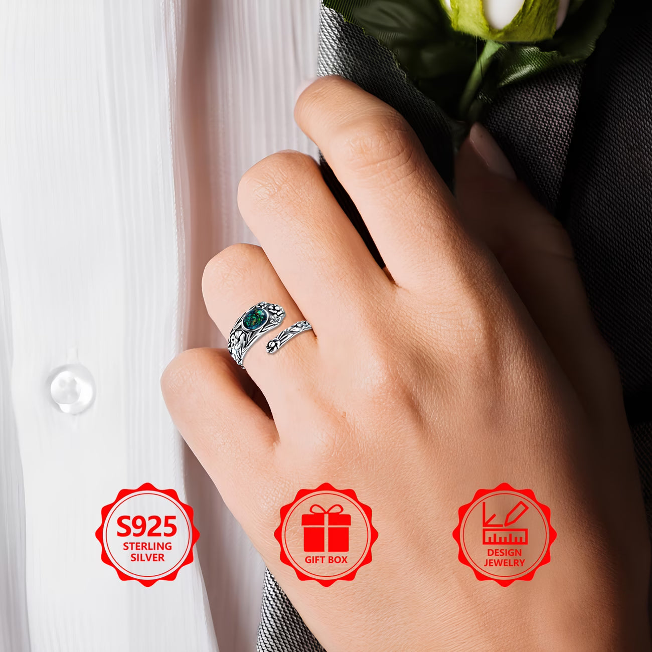 Sterling Silver Oval Opal Flower Pattern Ring Adjustable size O-T