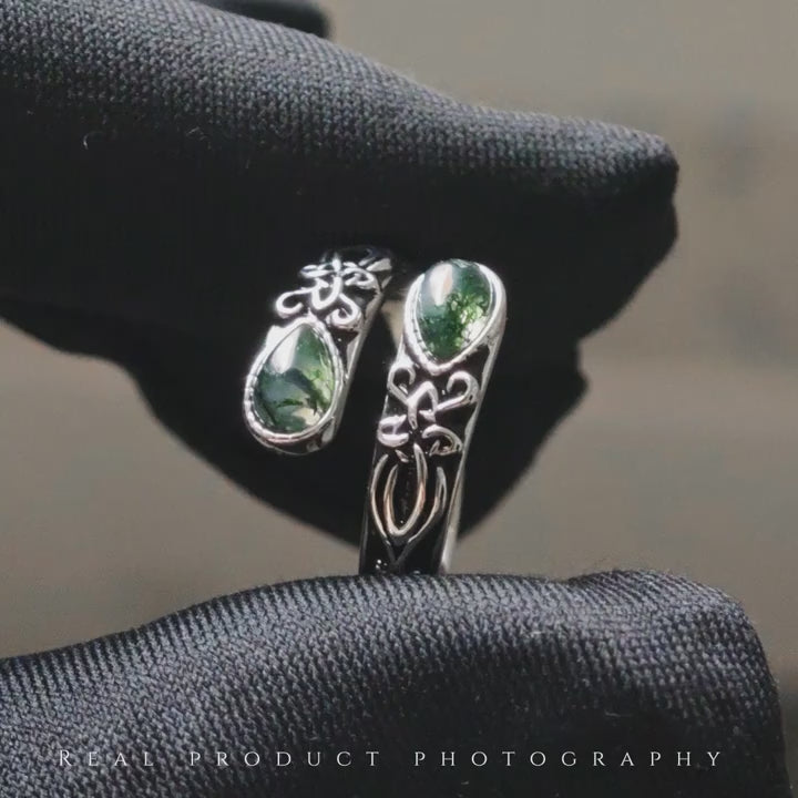 Sterling Silver Teardrop Moos Agate Celtic Knot Pattern Ring Adjustable size P-T